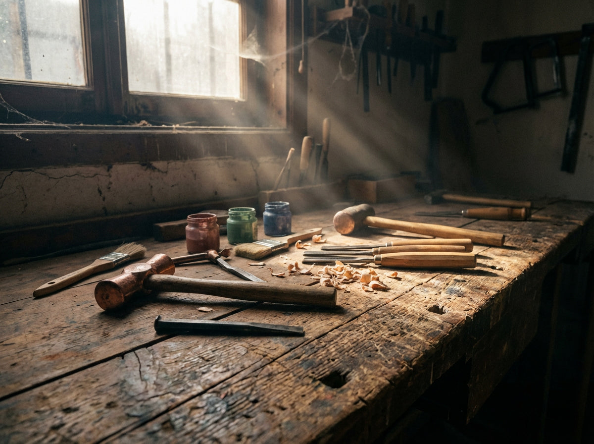 Ahşabın, kemik ve metalin sabır isteyen işçiliğiyle kendi hikâyesini eserlerine işler.
